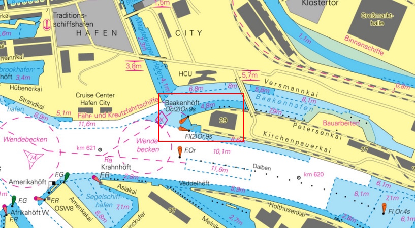 Baakenhöft (Nr. 1224), auf der Huk an der S-Seite der Einfahrt zum Baaken-Hafen Geogr. Lage: 53°32´24´´N-Br. 10°0´27´´O-Lg. Baakenhöft (Nr. 1225), auf dem Führungsdalben des Pontons Baakenhöft Kennung: F. r. |