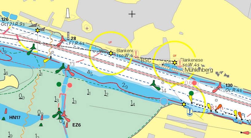 Unterfeuer Blankenese (B 1568.7) Geogr. Lage: 53°34´N 9°48´E Kennung: Iso. 4 s Höhe über Wasser: 41 m Höhe über Erdboden: 42 m Tragweite: 13 M Angaben: Rot-weiß waagerecht gestreifter Turm. ![]() Oberfeuer Blankenese (B 1568.71) Geogr. Lage: 53°34´N 9°48´E Kennung: Iso. 4 s Höhe über Wasser: 84 m Höhe über Erdboden: 40 m Tragweite: 16 M Angaben: Rot-weiß waagerecht gestreifter Turm, 1350 m vom Unterfeuer. Gleichgängige Richtfeuerlinie 098,3°. ![]() |