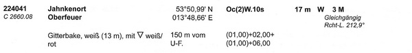 ![]() Unterfeuer Jahnkendorf Position: 53°51´N, 13°49´E Kennung: Oc (2) 10 s Nenn-TW: 9 M Höhe über Wasser: 10 m Höhe über Erdboden: 10 m Angaben: weiße Gitterbake mit weiß-rot umrandetem △ ![]() Oberfeuer Jahnkendorf Position: 53°51´N, 13°49´E Kennung: Oc (2) 10 s Nenn-TW: 9 M Höhe über Wasser: 17 m Höhe über Erdboden: 13 m Angaben: weiße Gitterbake mit weiß-rot umrandeten ▽, 150 m vom Unterfeuer. Foto: G.Liedtke 2005 ![]() |