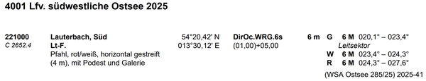 Des Weiteren haben sich die Sektoren des auf der Südmole Lauterbach befindlichen Leitfeuers wie folgt geändert:
