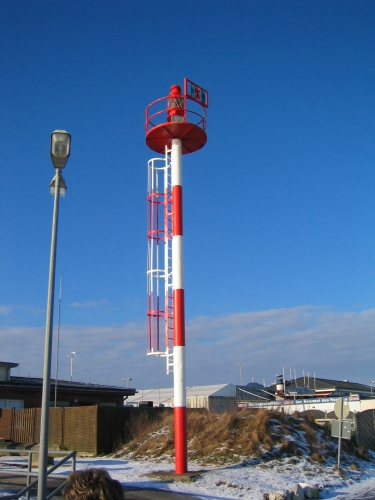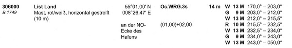 ![]() List Land (B1749 / 306000) Geogr. Lage: 55°01,00´N 008°26,47´E Kennung: Oc.WRG.3s Höhe über Wasser: 14 m Höhe über Erdboden: 10 m Tragweite: 13/10/9 M Angaben: Mast, rot/weiß, horizontal gestreift. Foto: G. Liedtke 2006 |