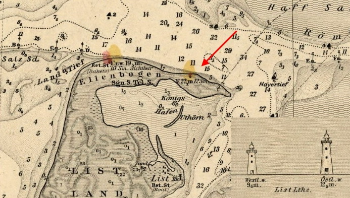 List, auf dem Nord-Ende der Insel Sylt; 2 feste Feuer rw. O¾S. und W¾N. 1,4 Seemeilen von einander