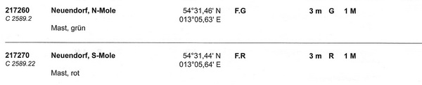N-Mole Neuendorf (217260 / C2589.2) Position: 54°31,46´N 013°05,63´E Kennung: F.G. Höhe über Wasser: 3 m Tragweite: 1 M Angaben: Grüner Mast S-Mole Neuendorf (217270 / C2589.2), Kopf Position: 54°31,44´N 013°05,64´E Kennung: F.R. Höhe über Wasser: 3 m Tragweite: 1 M Angaben: Roter Mast |