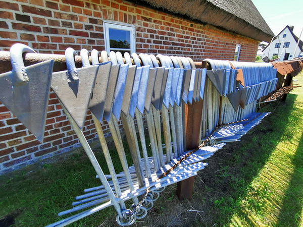 [Handbuch Ostsee v. 1959] "Hölzerne Masten mit Dreiecktoppzeichen über dem Hafenschuppen, führen in Linie zum Bollwerk der Gemeinde am Binnenstrand" |