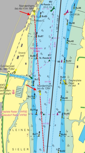 a) Nordenham-Unterfeuer auf ungf. 53°28,9´N 8°29,3´E