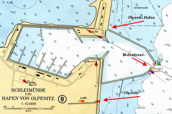 Trage ein: r. Blz (2) 5s, Olpenitz S-Mole ~ 54°39,53´N, 010° 02,50´E