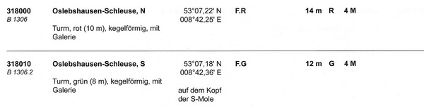 Schleuse Oslebshausen-Nord (B1306) Geogr. Lage: 53°07'N 008°42'E Kennung: F.R. 4M Höhe über Wasser: 14 m Höhe über Erdboden: 10 m Angaben: Roter kegelförmiger Turm mit roter Galerie und Laterne. Schleuse Oslebshausen-Süd (B1306.2) Geogr. Lage: 53°07'N 008°42'E Kennung: F.G. 4M Höhe über Wasser: 12 m Höhe über Erdboden: 8 m Angaben: Grüner kegelförmiger Turm mit Galerie und Laterne. Auf dem Kopf der S-Mole, SMG 300 m S-lich am S-Ufer ![]() |
