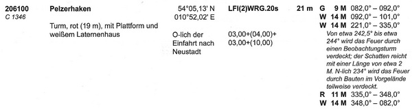 Neustadt, auf dem Pelzerhaken, 2 Seemeilen rw. OSO½O. vom Neustädter Hafen; 1 festes Feuer mit Blink von 15 Sek. Dauer alle 2 Minuten, dem eine Verdunkelung von 13 Sek. vorangeht und folgt.
