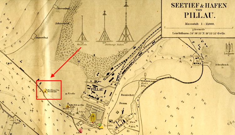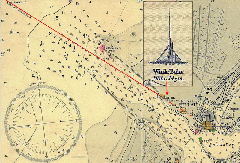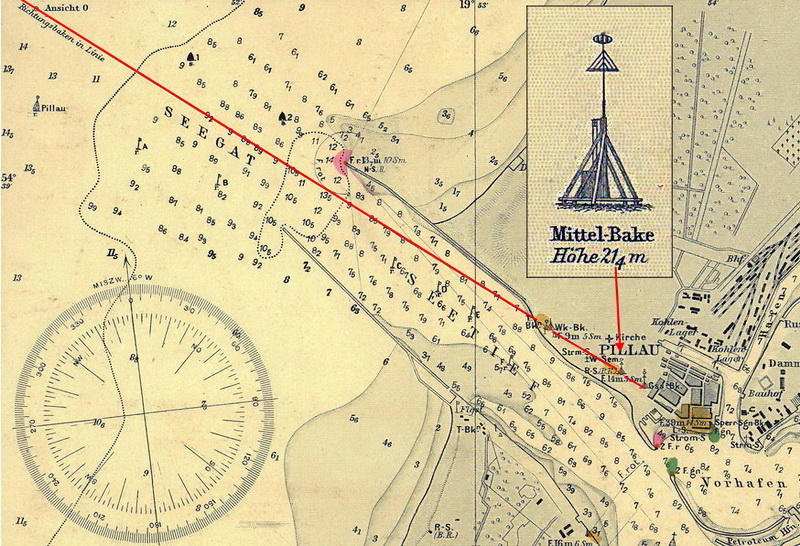 Die beiden Richtungsbaken in der Hafeneinfahrt von Pillau sind in die in der Karte angegebene Richtungslinie