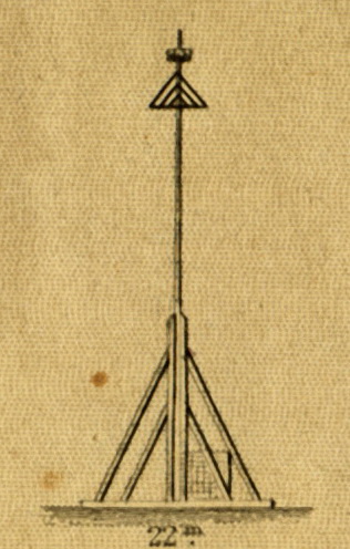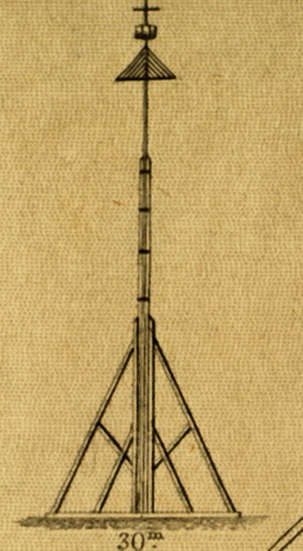 Beschreibung: Gerüst von Fichtenbalken, 12 m hoch, unten 12 m im Durchmesser. Läuft nach oben in eine Spitze