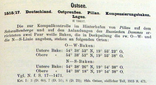 [Segel-Handbuch Ostsee, 1915] Zur Bestimmung der Fahrgeschwindigkeit von Torpedobooten ist südlich von Pillau auf der Frischen Nehrung eine Seemaile abgemerkt. Ihre Richtung liegt in der Deckpeilung des SW-Molenkopfes mit dem Leuchtturm auf dem NO-Molenkopfe des Hafens von Pillau. ![]() Die Deckpeilung des nördlichen Bakenpaares bezeichnet den Austritt aus der Meile oder Eintritt in dieselbe von SW. |