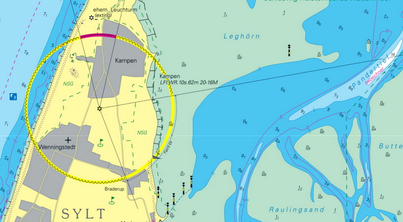 Rote Kliff (Nr. 69), auf dem hohen Lande ungefähr in der Mitte der Insel Sylt beim Dorfe Campen. Position: 54°56´50´´N-Br., 8°20´30´´O-Lg. ![]() Kennung: Ein weißes festes F. mit Blinken alle 4 Min. Beschreibung des Leuchtapparates: Linsenapparat 1. Ordnung, mit einem festen und beweglichen Theil und dem Rotationswerk. Unterer Teil: 7 katadioptrische Linsenfächer, in jedem Fach 16 Linsen von 435 mm x 130 mm. Mittlerer Theil: 5 cylindrische Linsenfächer, in jedem Fach 16 Linsen von 705 mm. Oberer Theil: 16 katadioptische Linsenfächer, jedes Fach mit 13 Linsen ... Das F. beleuchtet den ganzen Horizont beleuchtend. Brennmaterial: Rüböl Höhe der Flamme über Mittelwasser: 62,7 m Höhe der Flamme über Erdboden: 35,4 m Beschreibungung des Leuchtfeuergebäudes: Runder Thurm aus gelben Ziegelsteinen mit schwarzer Kuppe, in Mitte der nach N. und S. angebauten Beamtenwohnungen, aus gelben Ziegelsteinen mit Zinkdach, welche von See aus wegen Verdeckung durch Dünen nicht sichtbar sind. Bedienung des Feuers: 1 Feuermeister, 1 Assistent, 1 Wärter. Das Feuer ist errichtet: 1855. |