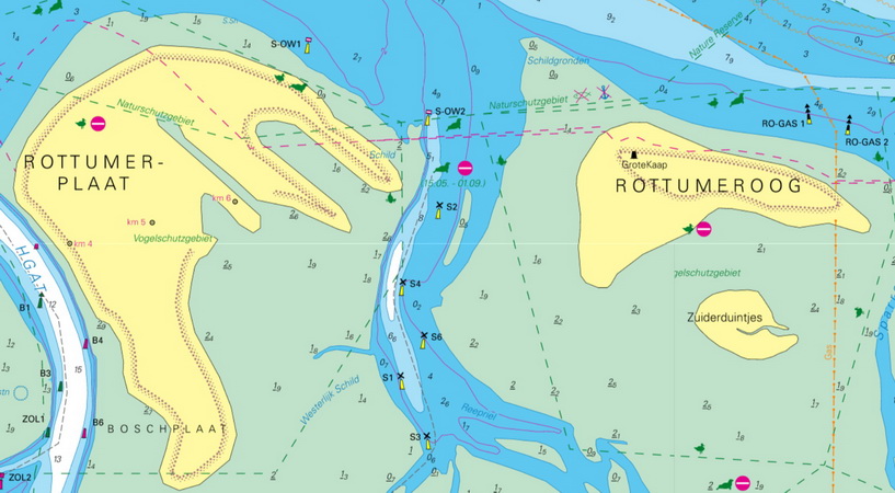 der nördlichsten oder der Groninger-Bake begonnen werden. Als Ersatz dieses Seezeichens soll zeitweise 100 m