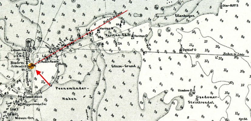 [Handbuch für die Küste der DDR, S. 81, SHD der DDR] "... Etwa in der Mitte der Insel stehen die beiden Ruden, S-Baken, deren Deckpeilung durch die Baggerrinne führt. Die Unterbake ist eine turmähnliche Leuchtbake auf einem Steinkegel..." ![]() |
