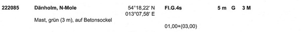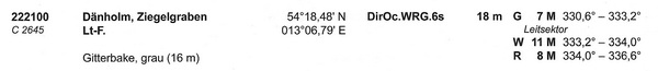 Unterfeuer Dänholm (C2645, 12220) Position: 54°18´N, 13°07´E Kennung: Ubr.r.-6s Höhe über Wasser: 12 m Höhe: 13 m Angaben: schwarzer Dalben mit grauer Gitterbake, N-lich der Einfahrt zum Dänholm. Oberfeuer Dänholm (C2645.1, 12221) Position: etwa 1,5 kbl vom U-F. Kennung: Ubr.r.-6s Höhe über Wasser: 18 m Höhe: 16 m Angaben: Graue Gitterbake auf Betonunterbau Rcht-F-L. 334°