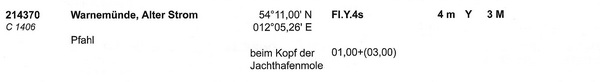 Alter Strom (C 1407.4), beim Kopf der Jachthafenmole Geogr. Lage: 54°11´N, 12°05´E Kennung: F. Höhe über Wasser: 4 m Tragweite: 4 sm Angaben: Dalben, beim Kopf