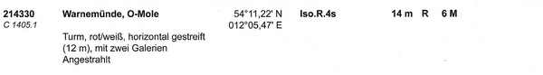 Warnemünde, O-Mole (214330, C 1405.1) Geogr. Lage: 54°11,22´N 12°05,47´E Kennung: Iso.R.4s Höhe über Wasser: 14 m Höhe über Erdboden: 12 m Tragweite: 6 M Angaben: Rot-weißer Turm, horizontal gestreift mit zwei Galerien; angestrahlt.