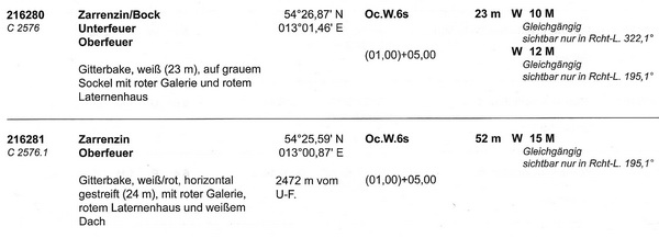 02.06.2014 entfallen sämtliche Sektoren des Oberfeuers Bock/Unterfeuers Zarrenzin und des Unterfeuers Bock. Stattdessen